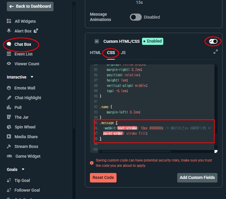 Kick+StreamLabsの画面コメント表示に影をつける